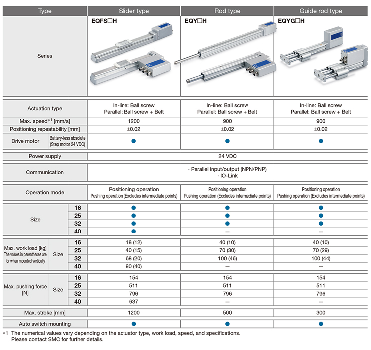 Battery-less absolute (Step motor 24 VDC) | EQY16□H | 50 to 500 | MAX.18 | MAX.800 | 2.5, 5, 10 |