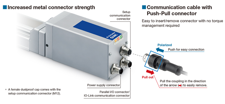 Robust metal Push-Pull connector provides easy to insert/remove communication cable